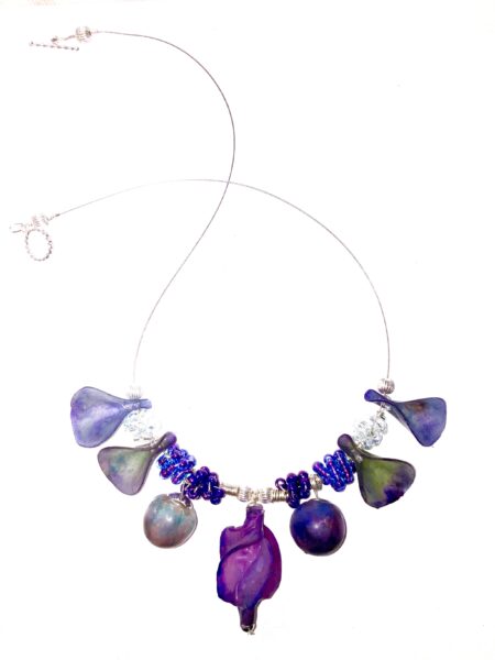 Our translucent polymer clay necklaces have handmade beads sculpted from translucent Polymer Clay. Polymer clay is a phenomenal artist medium made of a moldable plastic and it has been embraced and beloved by artists worldwide. The reason why it is so popular is that it is so versatile and can be manipulated so freely and with so many techniques that the results are fabulous. Our necklace artist, Kimberly Franklin, uses many different types of Polymer Clay but primarily, “Pardo Professional Translucent Clay”. Many times the clay is over-baked clay made of Pardo, and other times, our necklaces are made with air-dry clays such as “Lumina,” which has amazing strength and holds texture, colors, and delicate sculpting superbly! When each bead or sculpted form is made, it either cures in an oven or in plain air. But once cured, the clay beads/sculptures are extremely hard, strong and durable., yet they are lightweight which makes them perfect for jewelry.