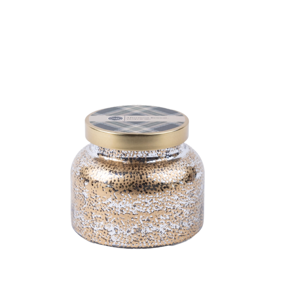 Welcome to the Afternoon Retreat Line of Candles, which is one of our most exotically blended, best-selling burning experiences you will likely ever experience. Named for it's ability to deliver you to a restful place, Afternoon Retreat fragrance captures your senses and lifts you away on a journey of delicate mossy teaks, sandalwoods, amber, citrus notes of bergamot and lime, and anise. This Afternoon Retreat Mercury Glass Candle is housed in this elegant golden/mercury glass.