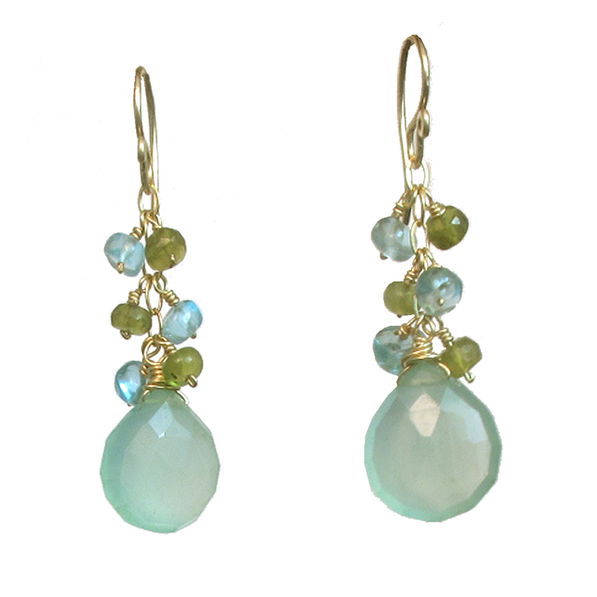 These aqua blue drop earrings are lovingly and meticulously handcrafted in the USA by skilled artisans. Created with quality from start to finish, aqua blue drop earrings of this level of detail and quality will bring your wardrobe beauty for years to come, as they are designed to last. The creation process starts first with detailed sketches which are then carefully and intricately hand-engineered with gold, silver and semi-precious gems and pearls. Breezy aqua blue drop earrings like these are first made by hammering gold or silver into drop-shapes and then adding the “seed” gems or beads. This particular pair is made by “weaving” the tiny Peridot, Apatite, and sea-blue Chalcedony gems into the shape you see which creates a very “lacy” or “crocheted” effect which can resemble filigree and becomes a very intricate attribute. These aqua blue drop earrings made of actual peridot and apatite with sea blue chalcedony, and they hang 1-1/2″ long. Available in either 14K gold-filled, rose gold-filled, or sterling silver. This piece is entirely handmade by Calico Juno Designs in their studio in New York City.
