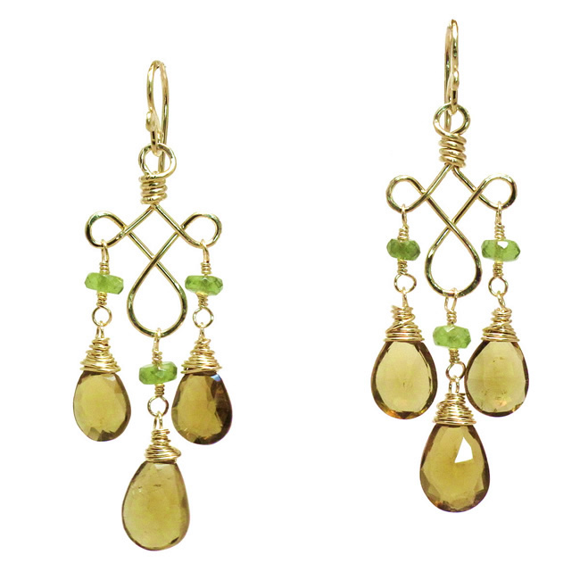 These golden brown gemstone earrings are lovingly and meticulously handcrafted in the USA by skilled artisans. Created with quality from start to finish, golden brown gemstone earrings of this level of detail and quality will bring your wardrobe beauty for years to come, as they are designed to last. The creation process starts first with detailed sketches which are then carefully and intricately hand-engineered with gold, silver and semi-precious gems and pearls. Brown gemstone earrings like these are first made by hammering gold or silver into drop-shapes and then adding the “seed” gems or beads. This particular pair is made by “weaving” the tiny peridot and whiskey quartz gems into the tiny chandeliers you see which creates a very intricate look. These golden brown gemstone earrings are made with actual Peridot and whiskey quartz on hammered curled wire, and they are about 2″ long.Available in either 14K gold fill or sterling silver. This piece is handmade by Calico Juno Designs at their studio in New York City.