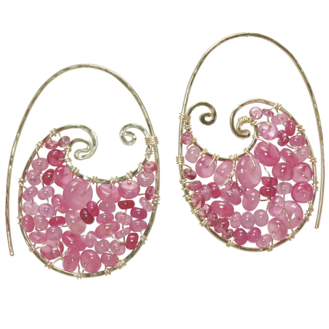 These swirled pink ruby dangle earrings are lovingly and meticulously handcrafted in the USA by skilled artisans. Created with quality from start to finish, ruby dangle earrings of this level of detail and quality will bring your wardrobe beauty for years to come. The creation process starts first with detailed sketches which are then carefully and intricately hand-engineered with gold, silver and semi-precious gems and pearls. Ruby dangle earrings like these are first made by hammering gold or silver into drop-shapes and then by adding the “seed” gems or beads. This particular pair is made by “weaving” the tiny rubies into the shape you see which creates a very “lacy” or “crocheted” effect which can resemble filigree and becomes a very intricate attribute. This popular pair of swirled pink ruby dangle earrings are about 2″ long.