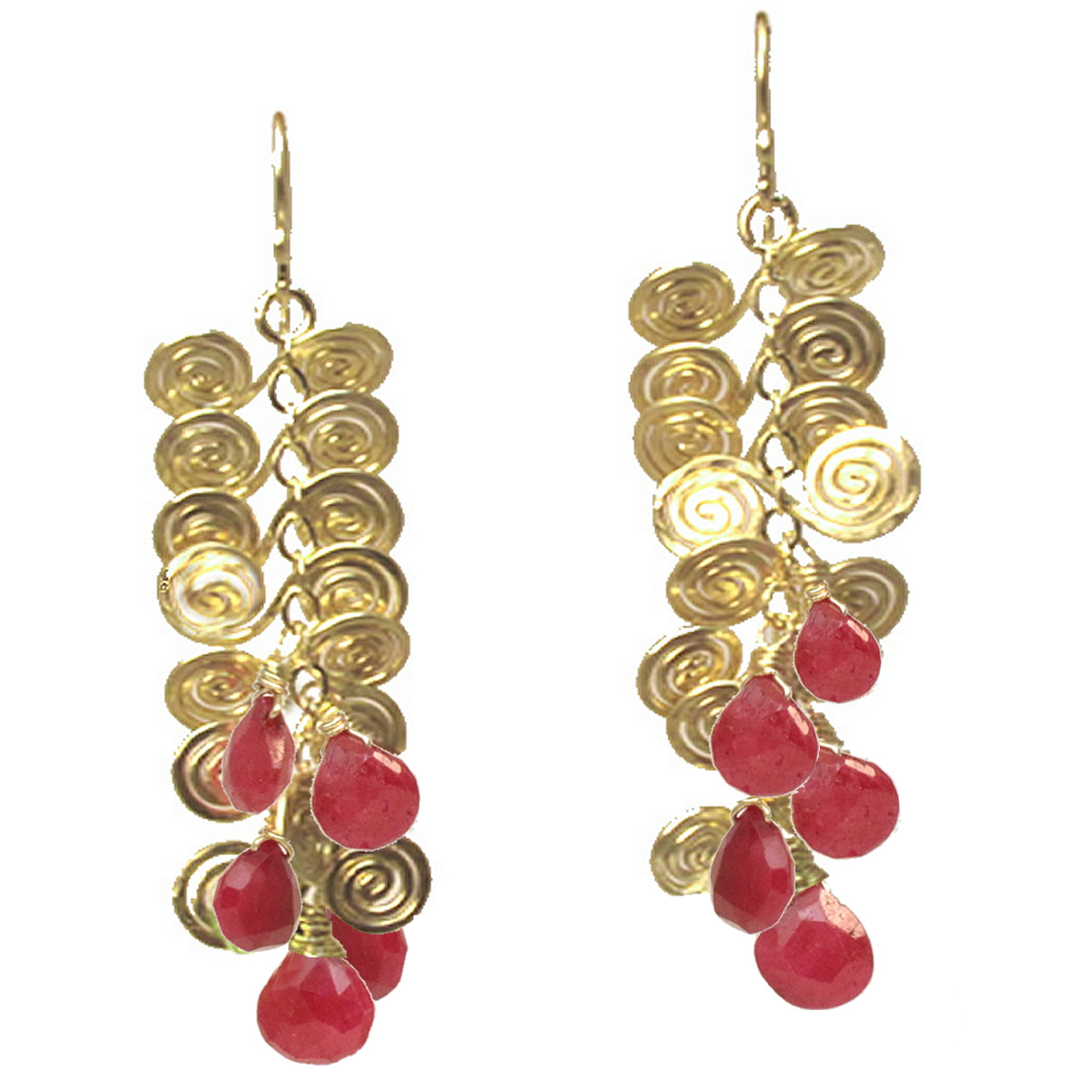These ruby drop earrings are lovingly and meticulously handcrafted in the USA by skilled artisans. Created with quality from start to finish, ruby drop earrings of this level of detail and quality will bring your wardrobe beauty for years to come, and they are designed to last. The creation process starts first with detailed sketches which are then carefully and intricately hand-engineered with gold, silver and semi-precious gems and pearls. Ruby drop earrings like these are first made by hammering gold or silver into drop-shapes and then adding the “seed” gems or beads. This particular pair is made by “weaving” the tiny rubies into the shape you see which creates a very “lacy” or “crocheted” effect which can resemble filigree and becomes a very intricate attribute. This pair of ruby drop earrings is made with spectacular, pink ruby gems on filagree wire with spiraled wire, and they hang about 2