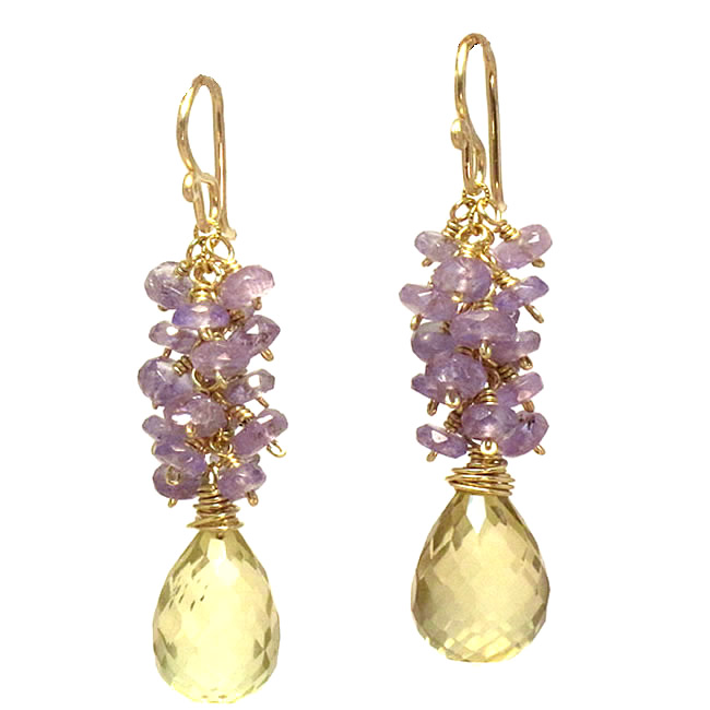 Lemon Quartz is a lemony yellow form of quartz that is mined in Brazil, but available in many areas. The rich yellow color of lemon quartz is truly dazzling, as it radiates warm light all over a room. As an alternate birthstone for February, Lemon Quartz is thought to stimulate a clear and bright outlook helping one to reach goals. Stunning and very refreshing to wear, these yellow stone dangle earrings are also made with purple Tanzanite, for a brilliant eye-catching contrast. Allow these bright and cheery earrings to brighten your outlook and your wardrobe!